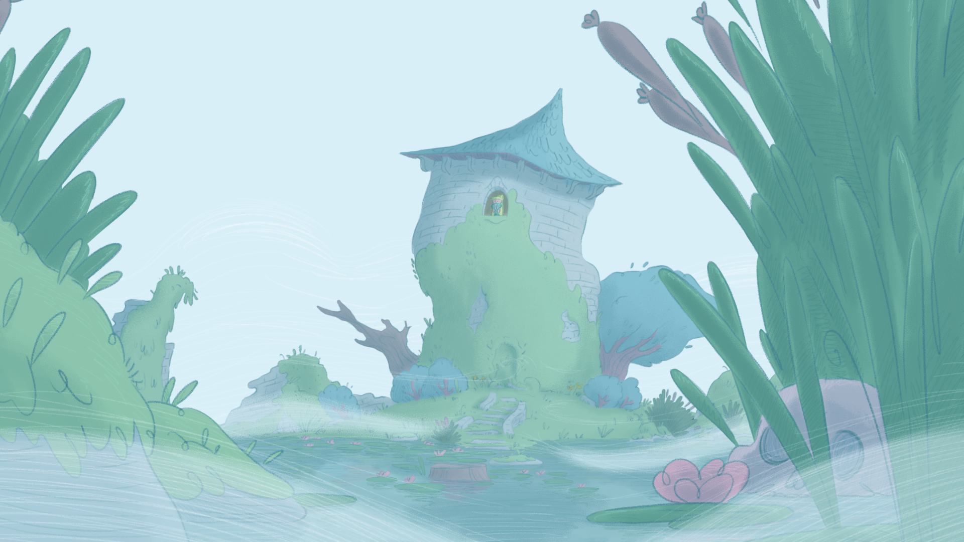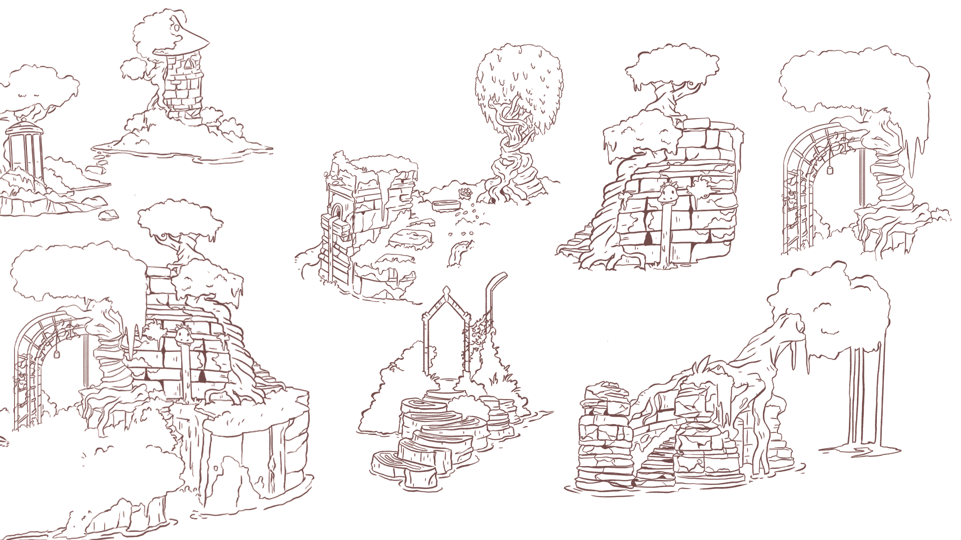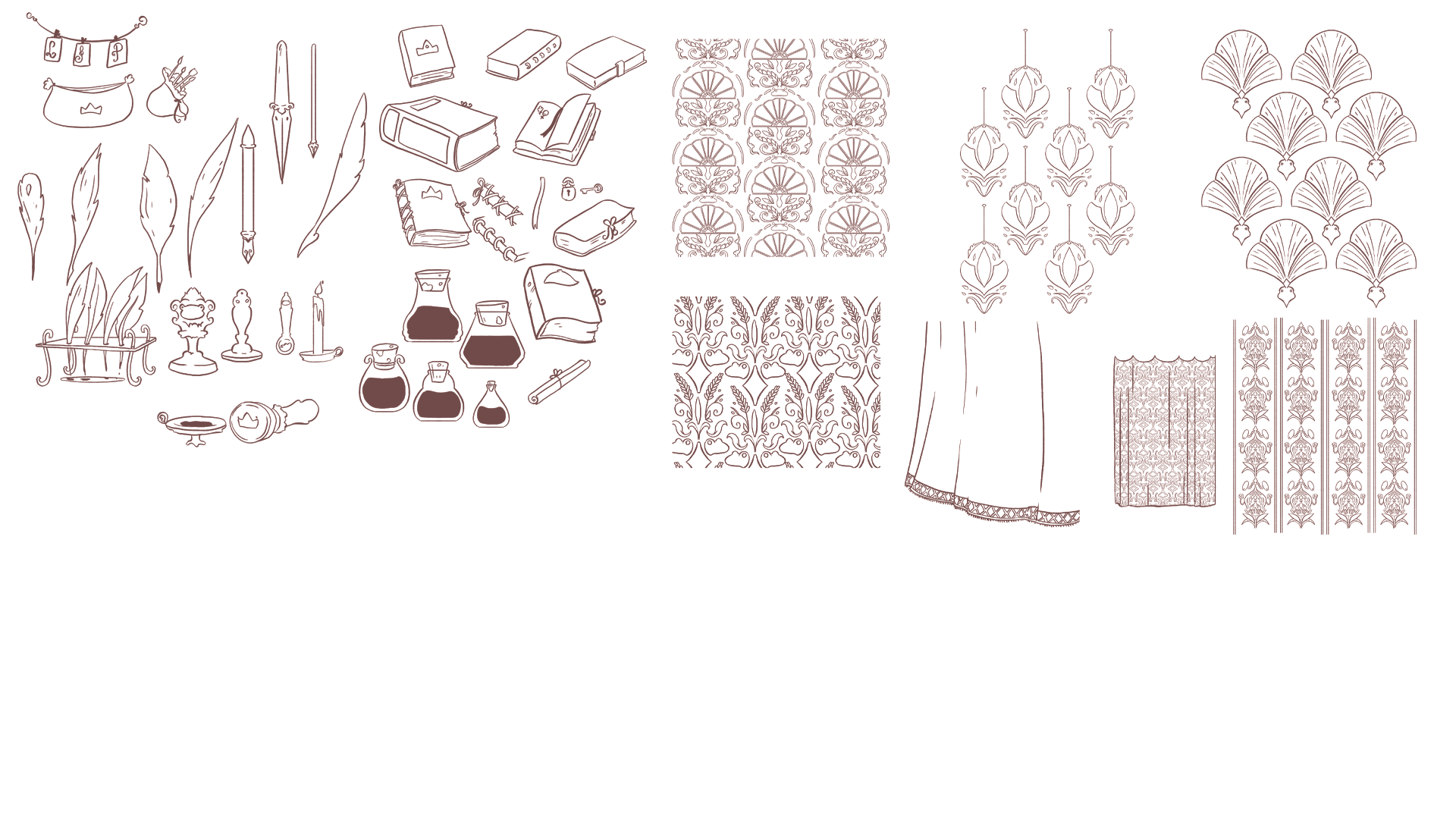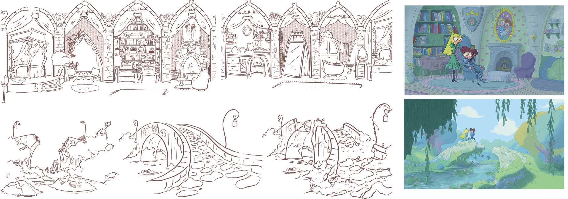 Pour ce projet, j'ai créé plusieurs dizaines de planches regroupant des croquis pour les décors intérieurs et extérieurs, incluant le château, des tours, le marais, la chambre de la princesse et celle du prince ainsi que différents petits objets de décoration.