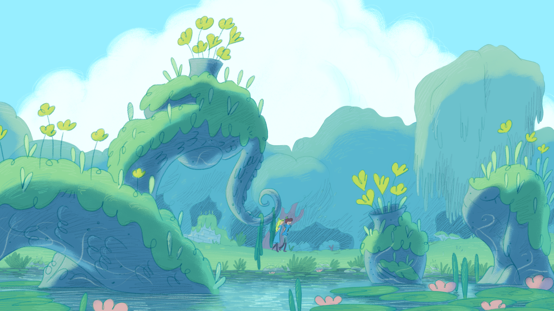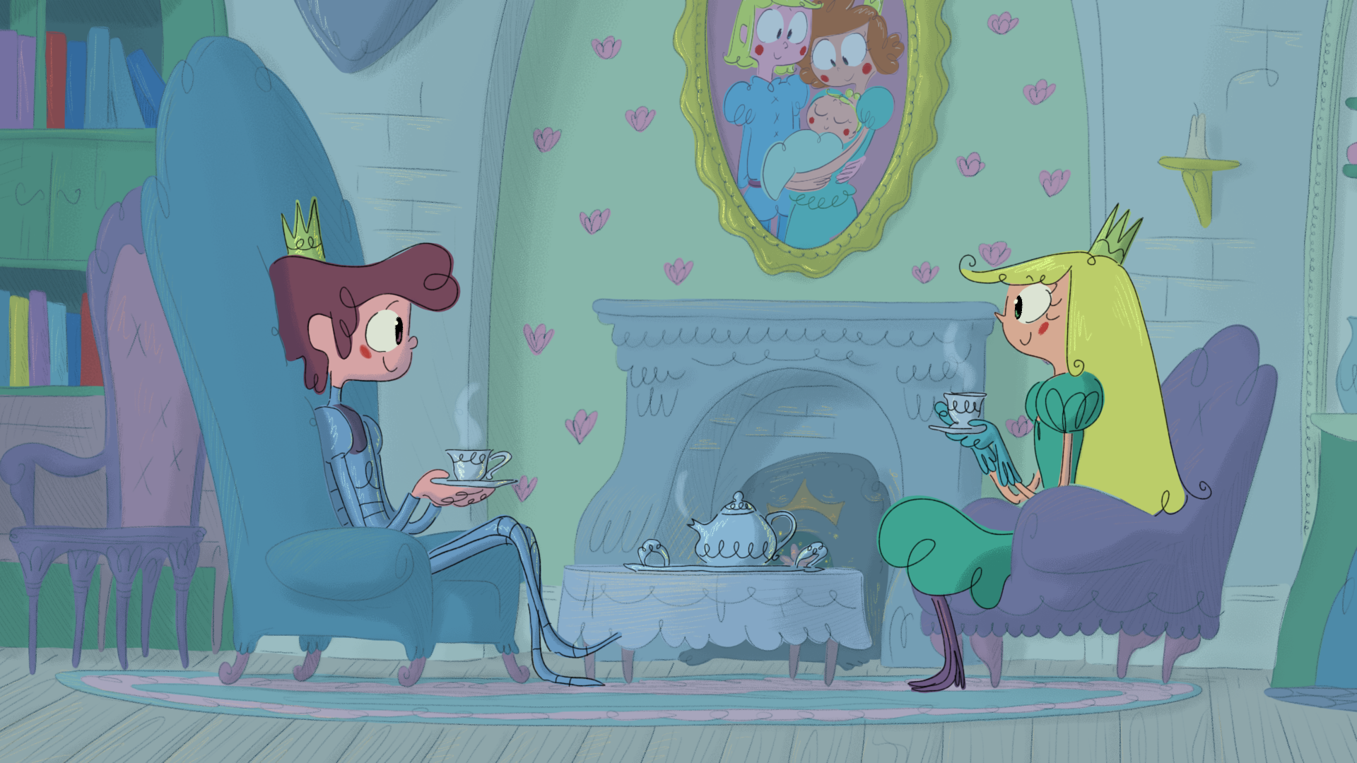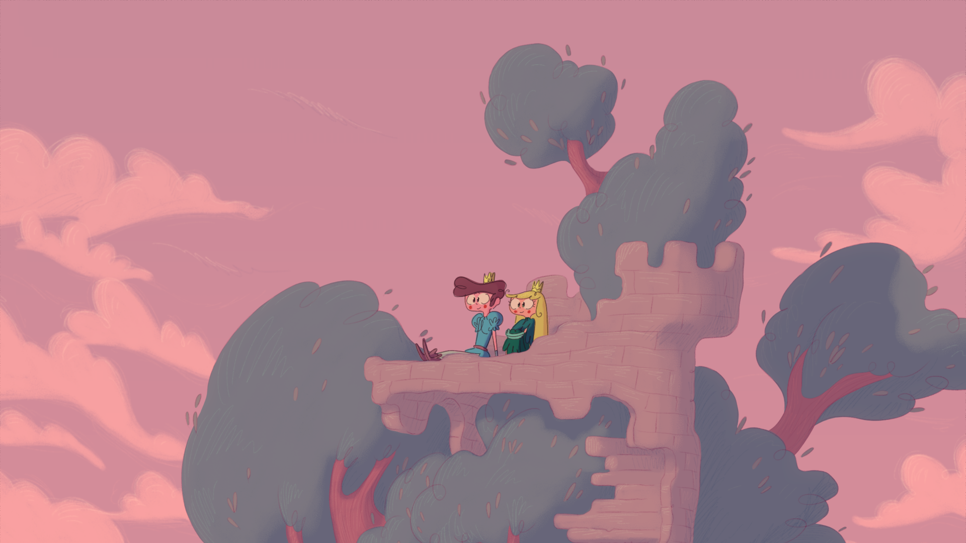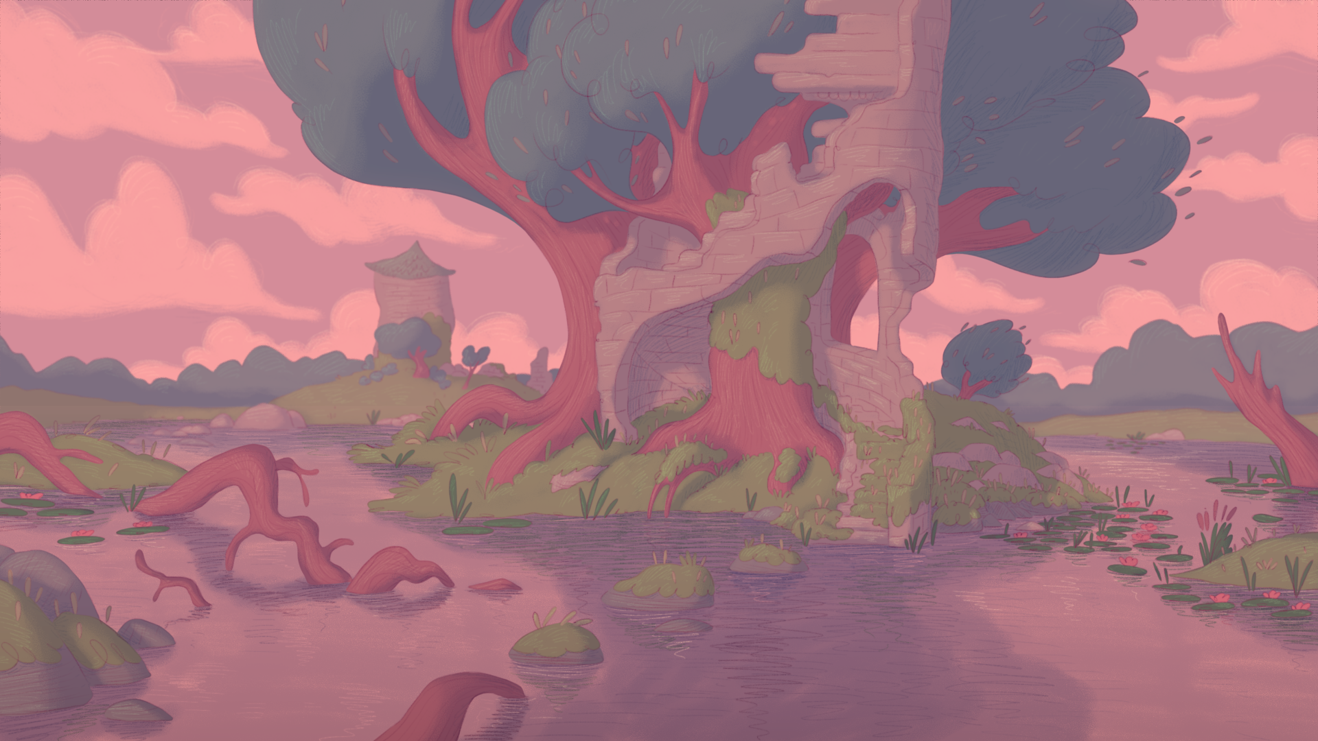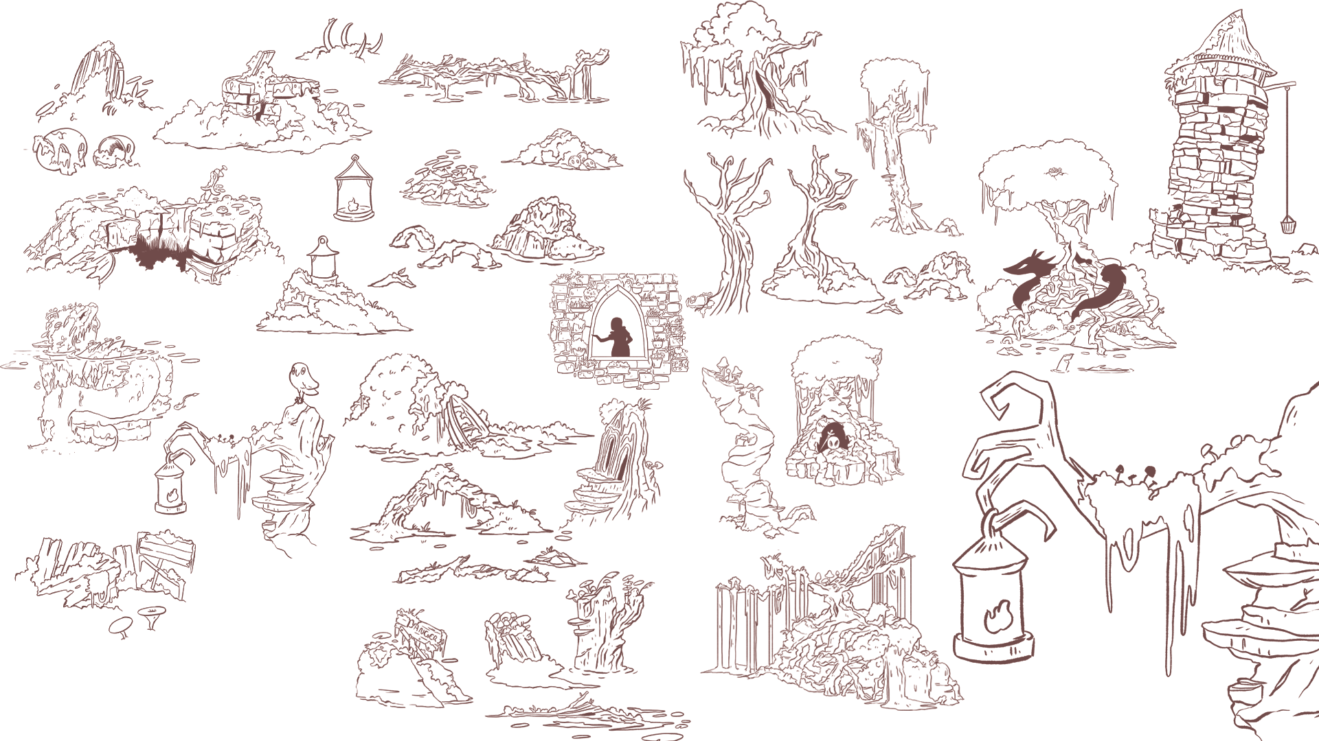 Pour ce projet, j'ai créé plusieurs dizaines de planches regroupant des croquis pour les décors intérieurs et extérieurs, incluant le château, des tours, le marais, la chambre de la princesse et celle du prince ainsi que différents petits objets de décoration.